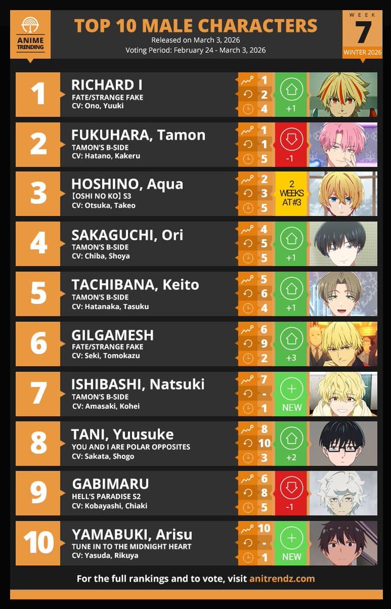 Here are your Top 10 Male Characters for Week#7 of the Winter 2026 Anime Season! Where to Vote? 👉