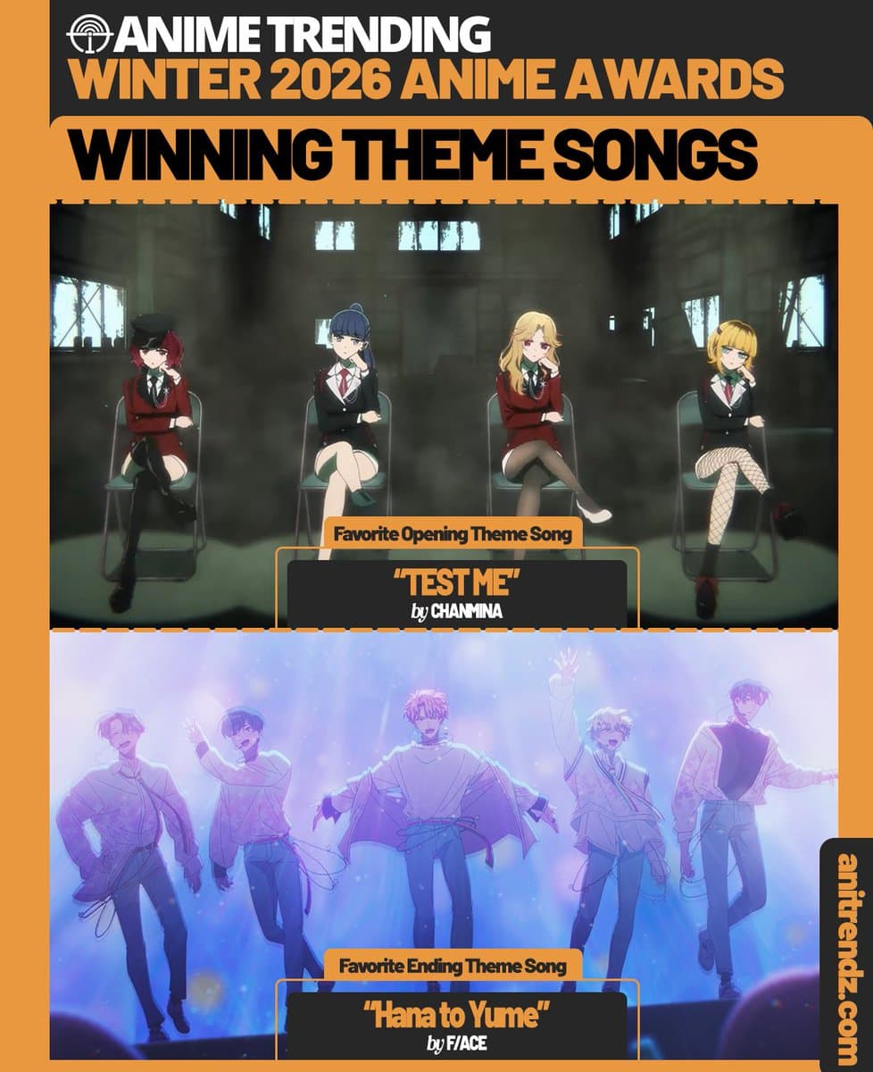 Here are the Winning Anime Theme Songs of the Winter 2026 Anime Awards of Anime Trending! CHANMINA's "TEST ME" wins Best Opening for Winter 2026, keeping OSHI NO KO's perfect streak alive! All three