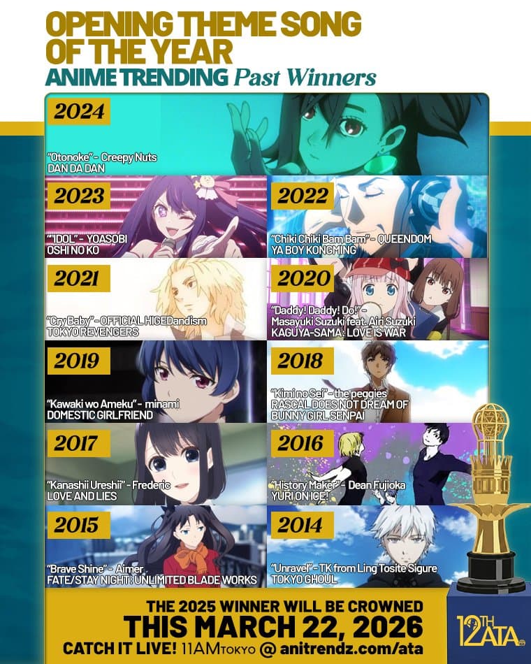 ⏳ 8 DAYS TO GO UNTIL THE 12TH ANIME TRENDING AWARDS! Today, let's take a look back at the winning OpeningTheme Songs of the Year here at Anime Trending! The last two winning artists, Creepy Nuts and