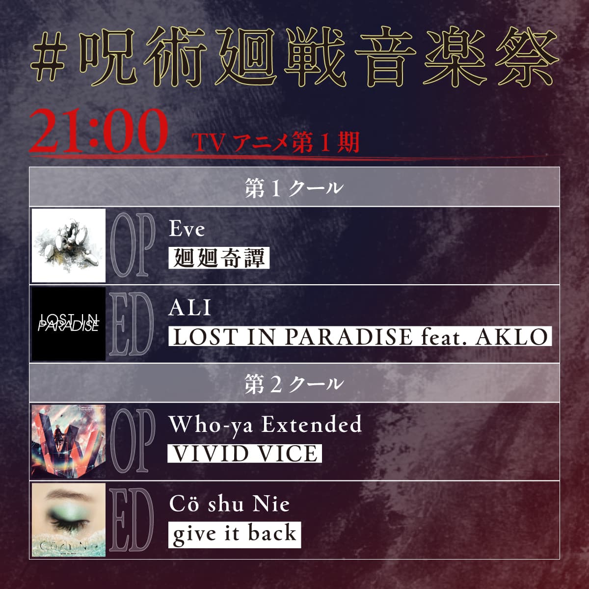 \ #呪術廻戦音楽祭 遊戯開始 / まずはTVアニメ第1期から!! Eve「廻廻奇譚」 ALI「LOST IN PARADISE feat. AKLO」 Who-ya Extended「VIVID VICE」 Cö shu Nie「give it back」 🎧プレイリストはこちら @oO0Eve0Oo @ALI_MUSIC_DANCE @wyxt_official @co_shu_nie
