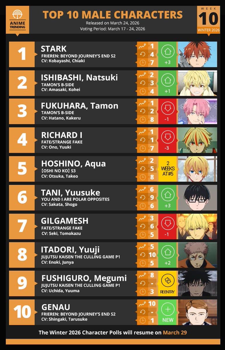 Here are your Top 10 Male Characters for Week#10 of the Winter 2026 Anime Season! The Character Polls will resume on March 29th as we await for all Anime of the Season contenders to air their final episodes.