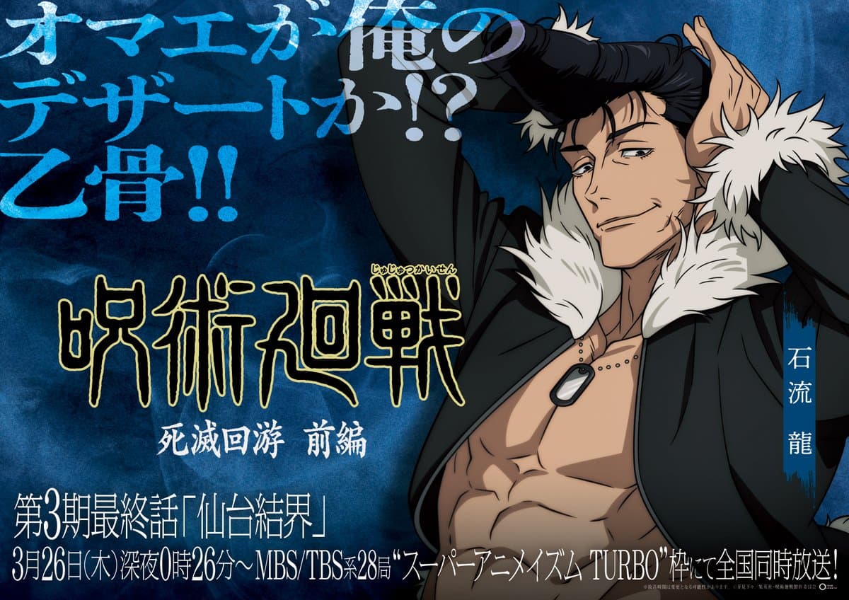 / TV アニメ第3期「#死滅回游 前編」 最終回「仙台結界」 放送まであと2️⃣日!! \ JR仙台駅にて展開されている キャラクタービジュアルポスターを順次公開!! 本日は #石流龍 最終回「仙台結界」は本編尺を拡大し、 特別尺(27分)での放送となります!! 3月26日(木)深夜0:26(24:26)~ お楽しみに!! #呪術廻戦 #JujutsuKaisen