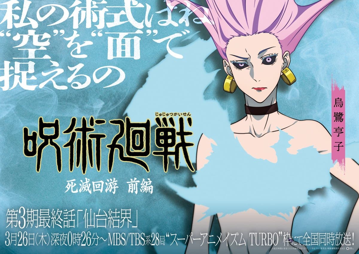 / TV アニメ第3期「#死滅回游 前編」 最終回「仙台結界」 放送まであと3️⃣日!! \ 本日よりJR仙台駅にて 展開されている キャラクタービジュアルポスターを順次公開!! 本日は #烏鷺亨子 最終回「仙台結界」は本編尺を拡大し、 特別尺(27分)での放送となります!! 3月26日(木)深夜0:26(24:26)~ お楽しみに!! #呪術廻戦 #JujutsuKaisen