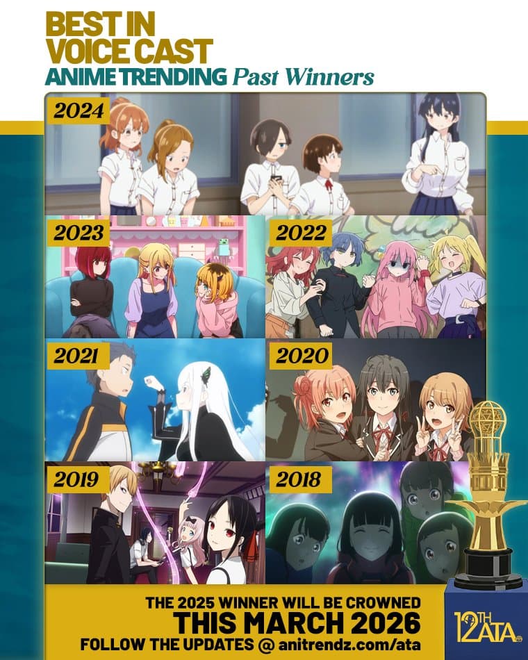 ⏳ THE 12TH ANIME TRENDING AWARDS IS COMING SOON! Today, let's take a look at the anime series that previously won Best in Voice Cast! First introduced in 2018—five years after the inaugural ATA—this category recognizes anime that flawlessly match voice