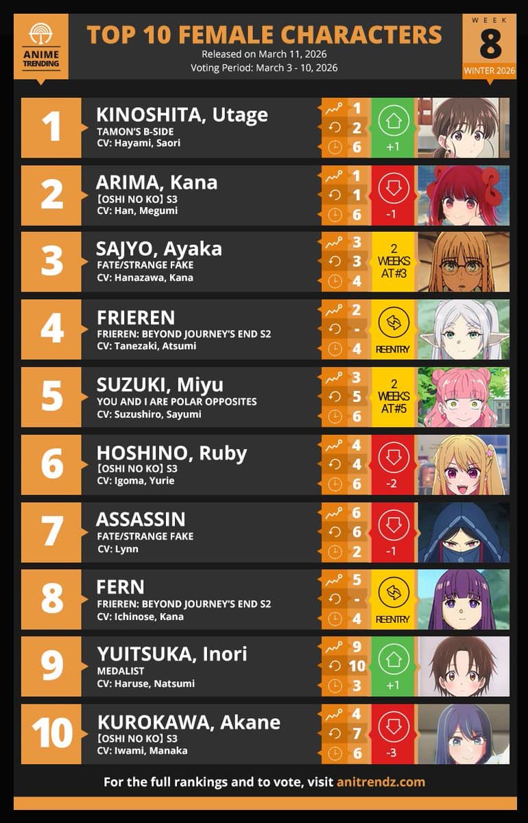 Here are your Top 10 Female Characters for Week#8 of the Winter 2026 Anime Season! Where to Vote? π