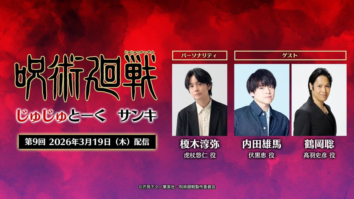 / 『#呪術廻戦』 「#じゅじゅとーく サンキ」 第9回配信!! \ ホストは虎杖役 #榎木淳弥 さん、 ゲストは伏黒役 #内田雄馬 さん 髙羽役 #鶴岡聡 さん そして、この後0:26から 第58話(第3期 第11話)「東京第1結界⑤」が放送! 本編と合わせてお楽しみください!! ▼ご視聴はこちら #死滅回游
