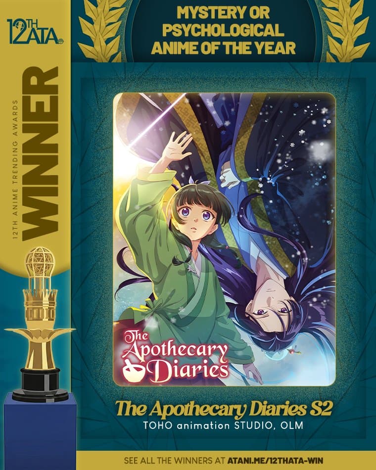 Congratulations to The Apothecary Diaries for winning MYSTERY OR PSYCHOLOGICAL ANIME OF THE YEAR at the 12th Anime Trending Awards! This is The Apothecary Diaries's first win tonight.
