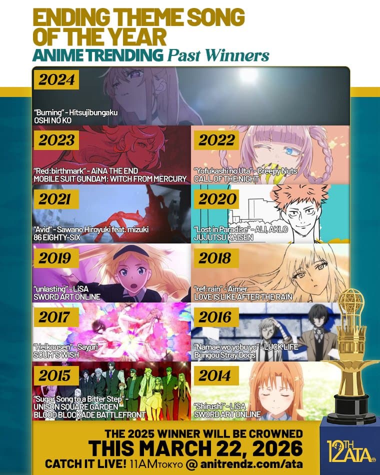 ⏳ 9 DAYS TO GO UNTIL THE 12TH ANIME TRENDING AWARDS! Today, let's take a look back at the winning Ending Theme Songs of the Year here at Anime Trending! Currently, LiSA holds the record for the most wins in this category, having won twice both for her