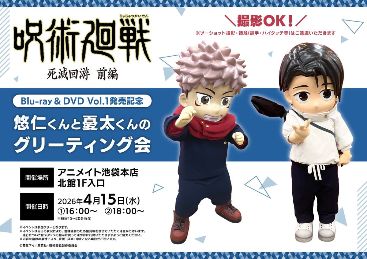 / #呪術廻戦 #死滅回游 前編 BD&DVD Vol.1発売記念 グリーティング会 実施決定!! \ 4/15(水)にアニメイト池袋本店にて #悠仁くん と #憂太くん の グリーティング会を開催!! ぜひ遊びに来てください!! 詳細はこちら #JujutsuKaisen