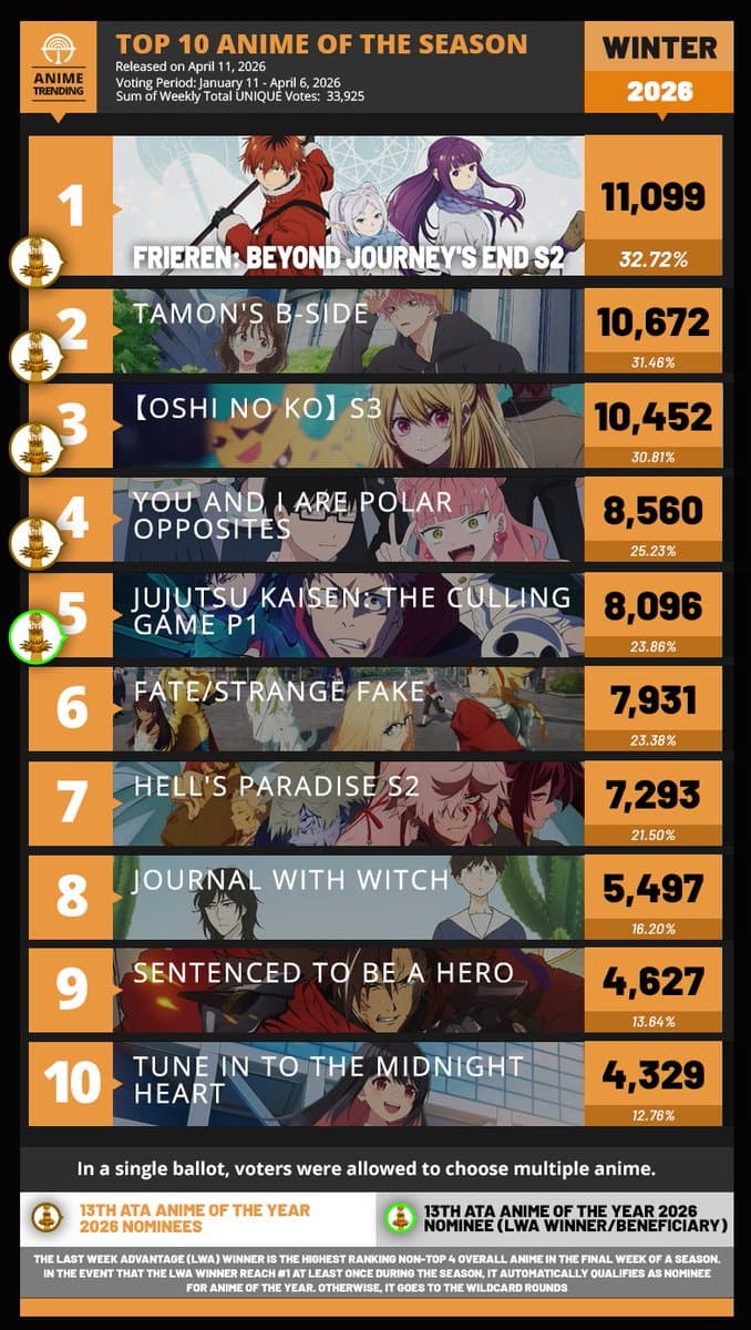 Here are your FINAL TOP 10 ANIME for the Winter 2026 Anime Season! Former ATA Anime of the Year 2024 Frieren: Beyond Journey's End, Tamon's B-Side, OSHI NO KO, and You and I are Polar Opposites ARE NOMINATED FOR ANIME OF THE YEAR Jujutsu Kaisen, despite