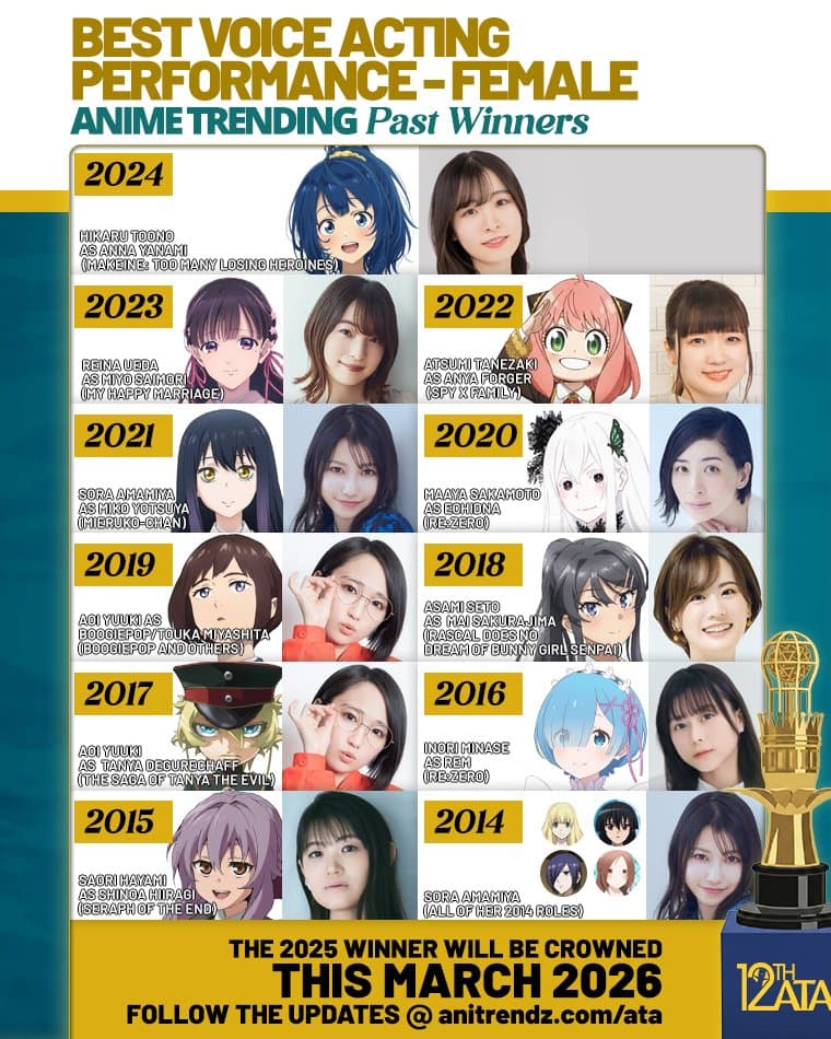⏳ THE 12TH ANIME TRENDING AWARDS IS COMING SOON! Let's look back at our Best Female VA winners! 🎙️ Sora Amamiya and Aoi Yuuki currently hold the record for most wins—and they’re both nominated again