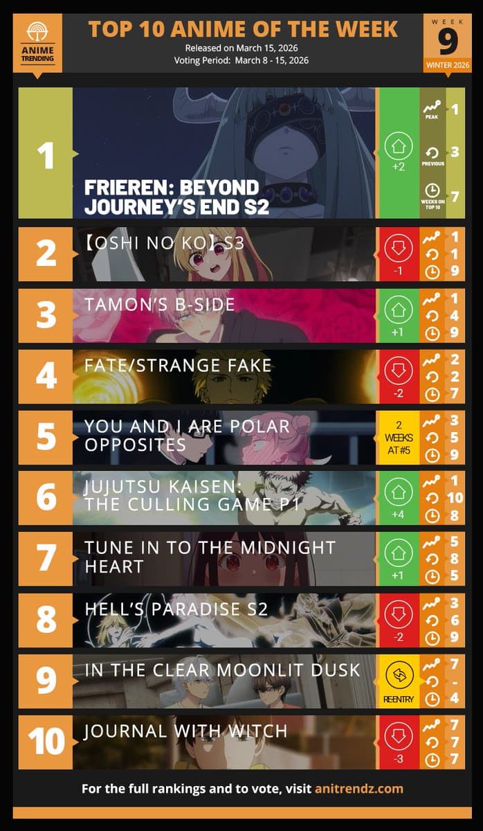 Here are your Top 10 Anime for Week#9 of the Winter 2026 Anime Seaon! Where to Vote? π