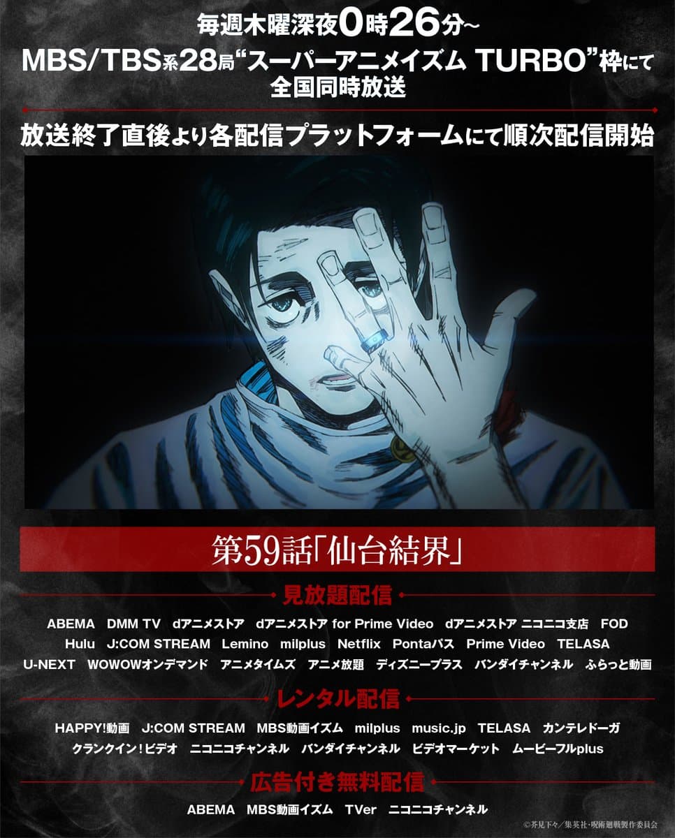 / 「#死滅回游 前編」 第59話(第3期 最終回) ご視聴ありがとうございました!! \ 最終回「仙台結界」 各配信プラットフォームにて順次配信開始!! ▼配信PF一覧はこちら ▼ABEMAでは全話無料配信中!!(過去作含む) #呪術廻戦 #jujutsukaisen