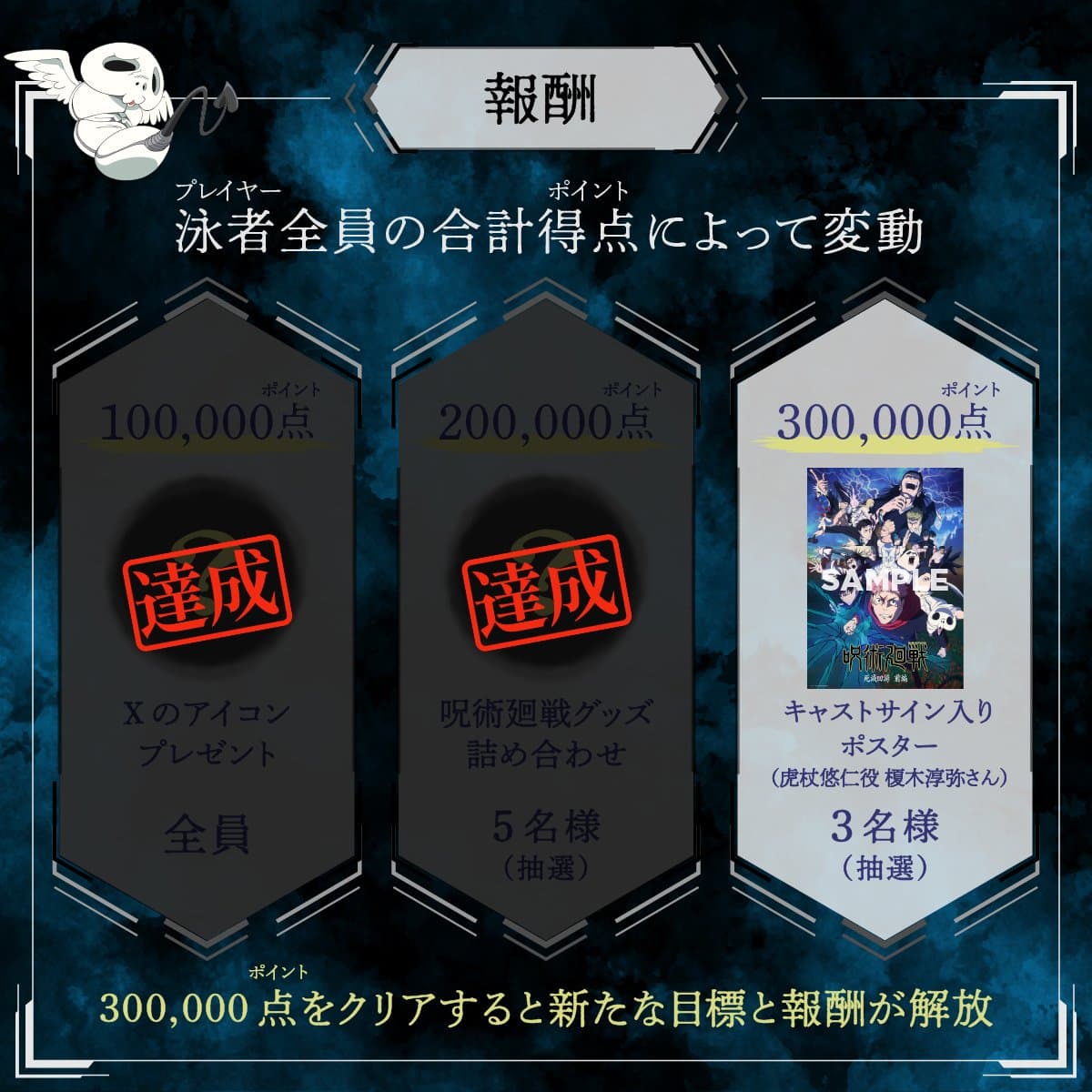 ■━━━━━━━━━━━━━■ #死滅回游参加中 グッズ詰め合わせプレゼント!! ■━━━━━━━━━━━━━■ 合計得点が200,000点を 突破した報酬として、 『#呪術廻戦 』グッズ詰め合わせを 抽選で5名にプレゼント!! 次の300,000点では #虎杖悠仁 役 #榎木淳弥 さん の サイン入りポスターを 抽選で3名にプレゼント!! 300,000点目指していいねやRP、
