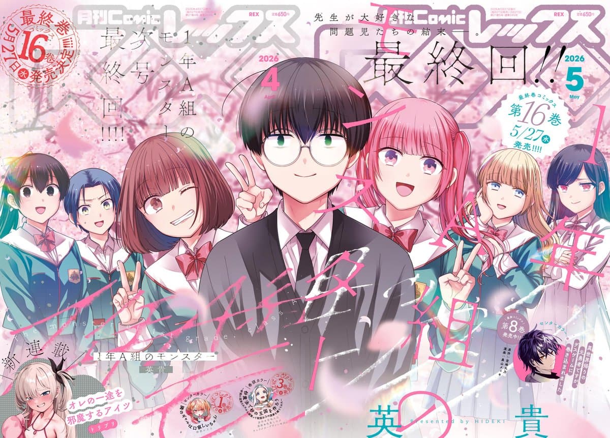 Combined cover for issue 4/2026 & 5/2026 of Comic Rex featuring "The Monsters of Class A, First Years" by Hideki to celebrate its last chapter! ▪︎Series will END in the issue 5/2026 out March 27, 2026. ▪︎Final volume 16 will be out May 27, 2026. ▪︎1.5