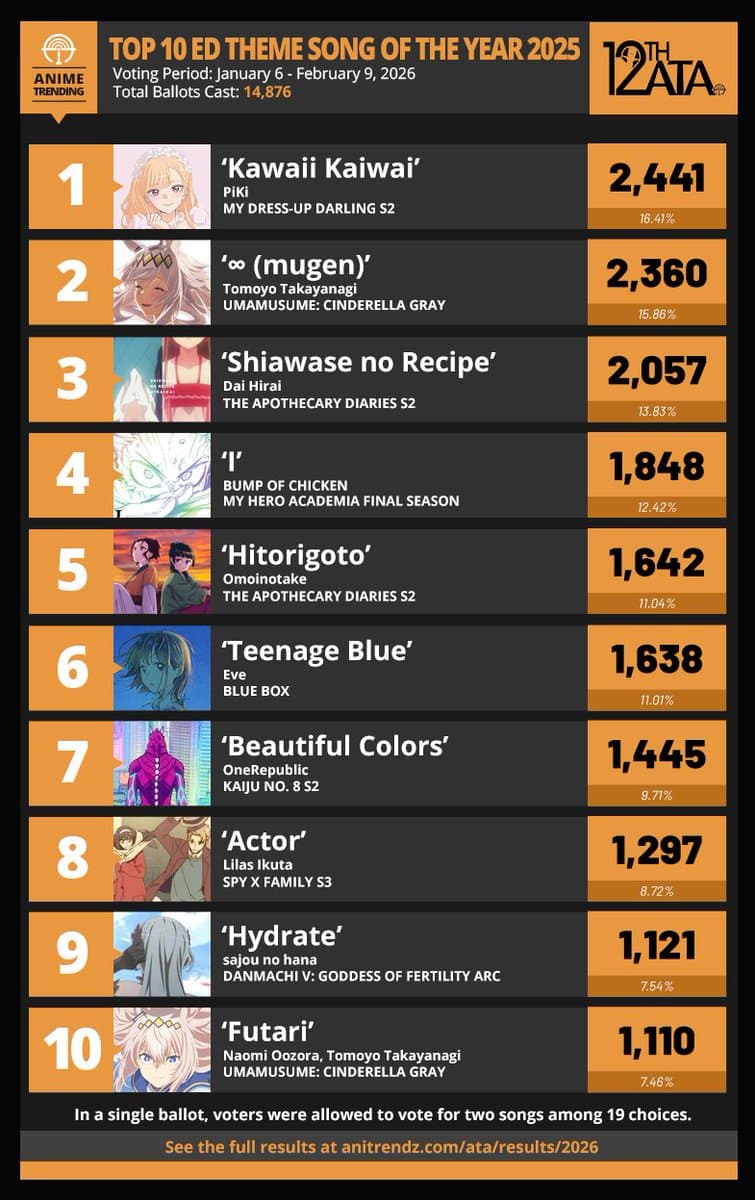 Here are your TOP 10 ENDING THEME SONGS OF THE YEAR for 2025 from the 12th Anime Trending Awards! "Kawaii Kaiwai" by PiKi wins Best Ending Theme Song of the Year, followed closely by "∞ (Mugen)" by