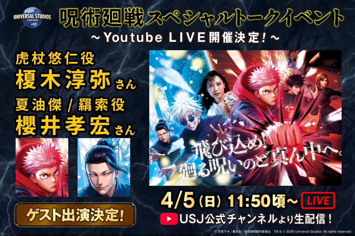 / 『#呪術廻戦 』×#USJ 明日4/5 (日) 11:50頃~ USJ公式YouTubeより ライブ配信をお届け!! \ 虎杖悠仁役 榎木淳弥さん、 夏油傑/羂索役 櫻井孝宏さんが出演し パークからスぺシャルトークライブをお届け!! お楽しみに!! 視聴はこちらから ※パークではご覧いただけません #jujutsukaisen