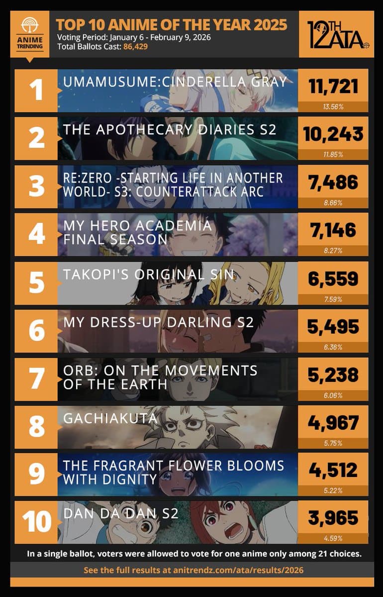Here are your TOP 10 ANIME OF THE YEAR for 2025 from the 12th Anime Trending Awards! π Full Results: Umamusume: Cinderella Gray caps off a dominant year, adds Anime of the Year to its 2 Anime of the