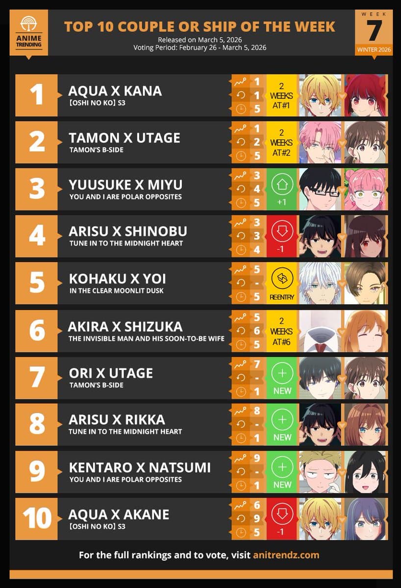 Here are your Top 10 Couples or Ships for Week#7 of the Winter 2026 Anime Season Where to Vote? π