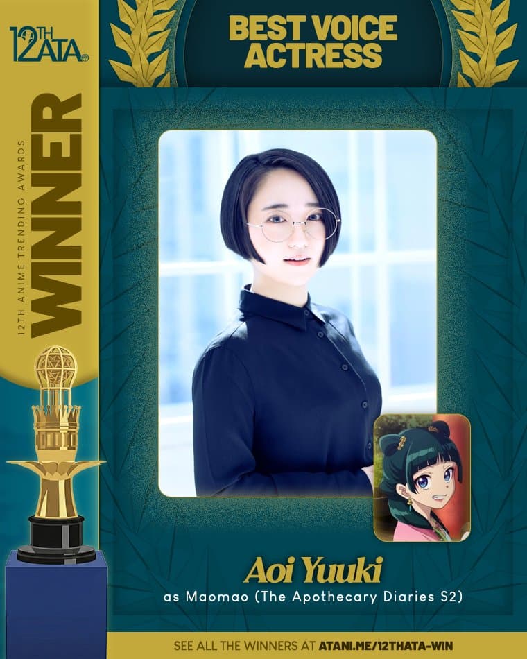 Congratulations to Aoi Yuuki for her role as Maomao in The Apothecary Diaries for winning BEST JAPANESE VOICE ACTING PERFORMANCE - FEMALE at the 12th Anime Trending Awards! This is Aoi Yuuki's fifth nomination and third win. This is The Apothecary