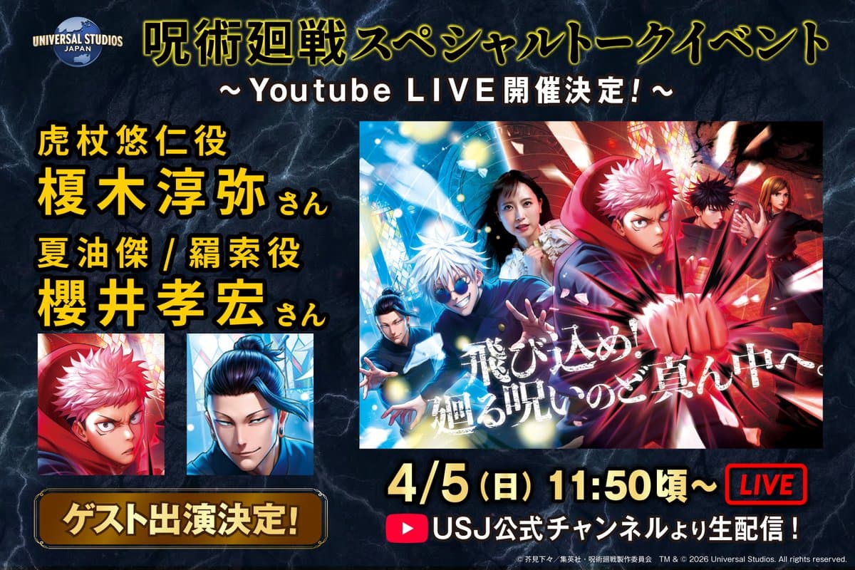 / 『#呪術廻戦』×#USJ 4/5 (日) 11:50頃~USJ公式YouTubeより ライブ配信をお届け!! \ 虎杖悠仁役 榎木淳弥さん、 夏油傑/羂索役 櫻井孝宏さんが出演し パークからスぺシャルトークライブをお届け!! お楽しみに!! 視聴はこちらから ※パークではご覧いただけません #jujutsukaisen