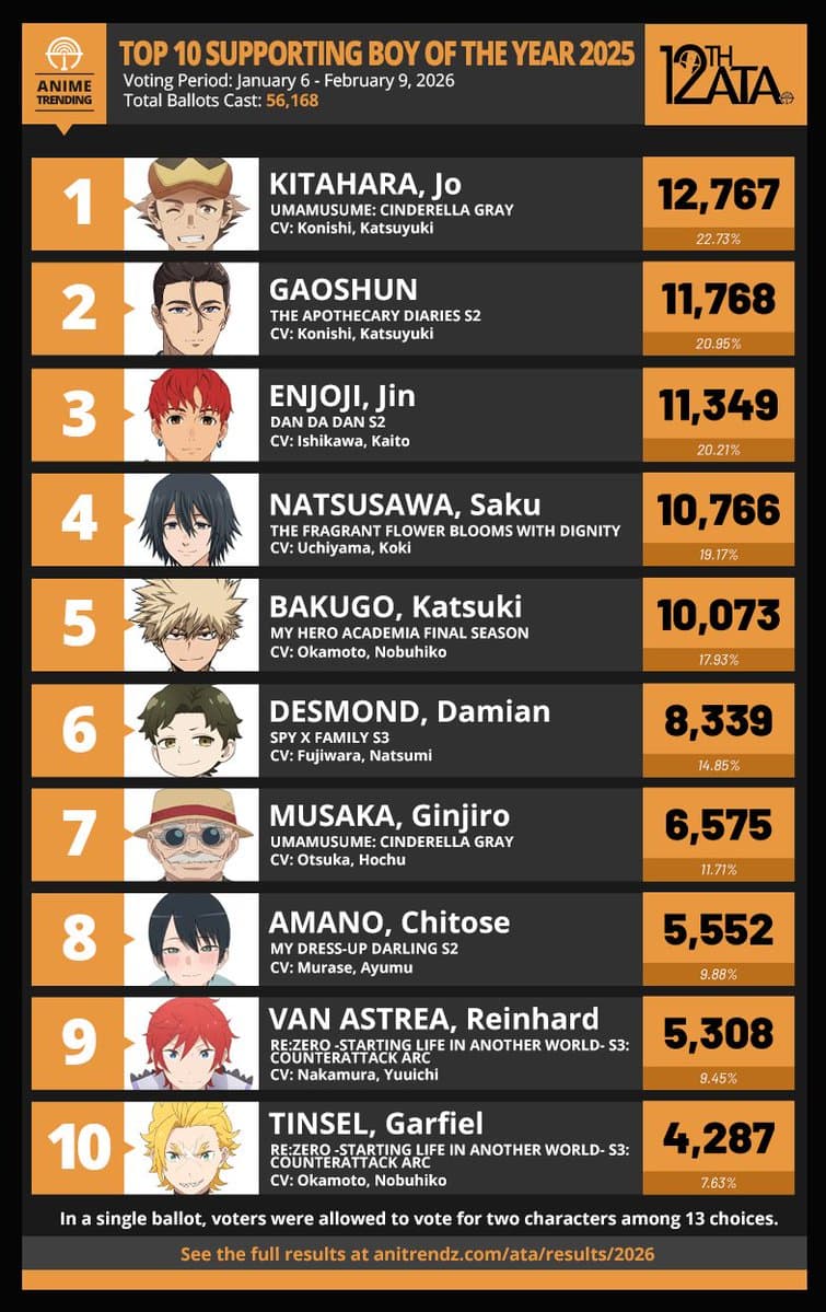 Here are your TOP 10 SUPPORTING BOY OF THE YEAR for 2025 from the 12th Anime Trending Awards! Double win for Katsuyuki Konishi! π His characters, Jo Kitahara and Gaoshun, just swept the top two spots for Best Supporting Male Character!