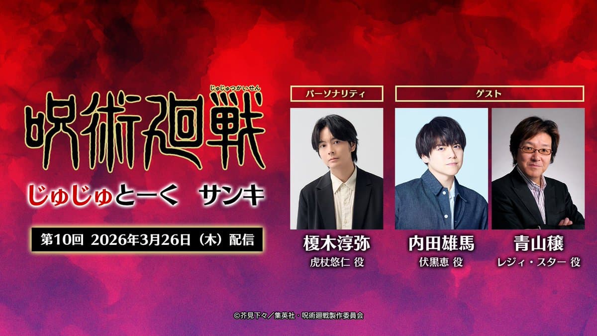 / 『#呪術廻戦』 「#じゅじゅとーく サンキ」 第10回配信!! \ ホストは虎杖役 #榎木淳弥 さん、 ゲストは伏黒役 #内田雄馬 さん レジィ・スター役 #青山穣 さん そして、この後0:26から 第59話(第3期 最終回)「仙台結界」が放送! 本編と合わせてお楽しみください!! ▼ご視聴はこちら #呪術廻戦 #死滅回游
