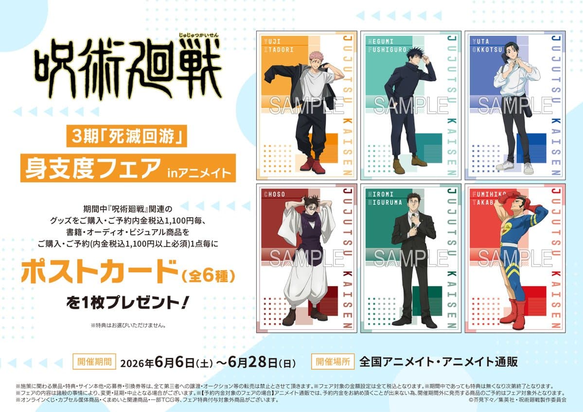 / 2026年6月6日(土)より TVアニメ『#呪術廻戦』3期「死滅回游」 身支度フェア inアニメイト 開催決定! \ TVアニメ『呪術廻戦』3期「死滅回游」 身支度フェア inアニメイトの開催が決定!! 身支度を整えるキャラクターたちがテーマの オリジナル描き下ろしイラストを解禁!! 描き下ろしイラストを使用したグッズも 多数発売予定です!! ▼詳細はこちら #死滅回游