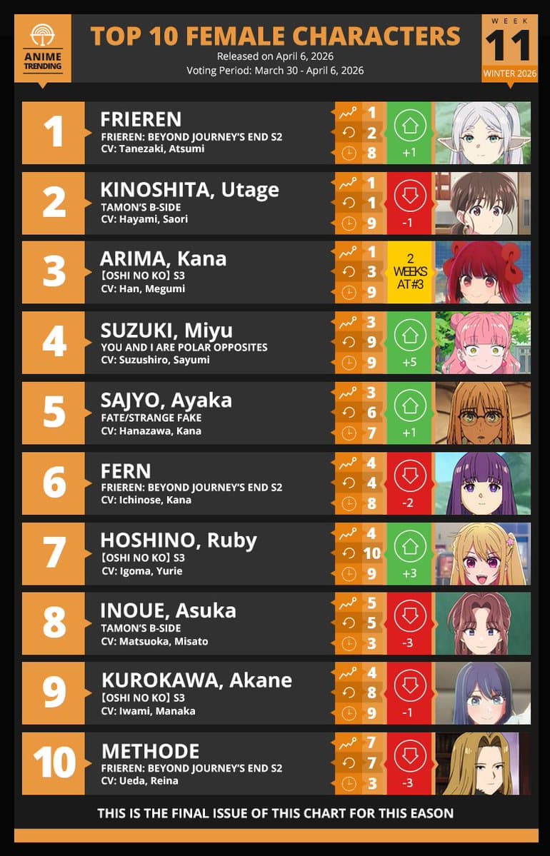 Here are your Top 10 Female Characters for Week#11 for the Winter 2026 Anime Season!