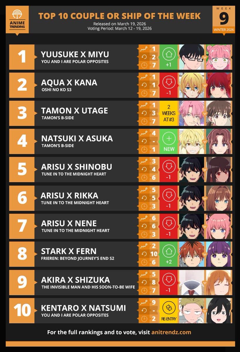 Here are your Top 10 Couples or Ships for Week#9 of the Winter 2026 Anime Season! Where to Vote? π