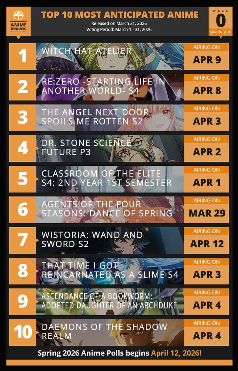 Here are your Top 10 Most Anticipated Anime for the Spring 2026 Anime Season! Full Results π