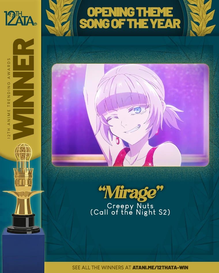 Congratulations to Call of the Night for winning OPENING THEME SONG OF THE YEAR at the 12th Anime Trending Awards! This award goes to Creepy Nuts for the opening. This is Call of the Night's first