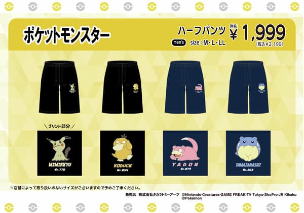 Don Quijote released Pokémon-themed clothing, including T-shirts with Monster Ball embroidery on the sleeves. The lineup includes designs featuring characters such as Mimikyu and Ditto.