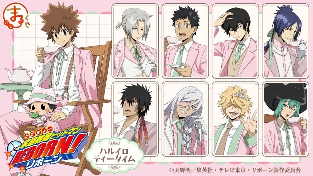 The “MaruKuji Kazen Kyoushi Hitman REBORN! Haruiro Tea Time” event has been announced, themed around “Spring Tea Time.” It will include newly illustrated items such as a drawn-for-the-product B2 fabric poster and acrylic stands featuring characters including Tsuna and Reborn, plus others.