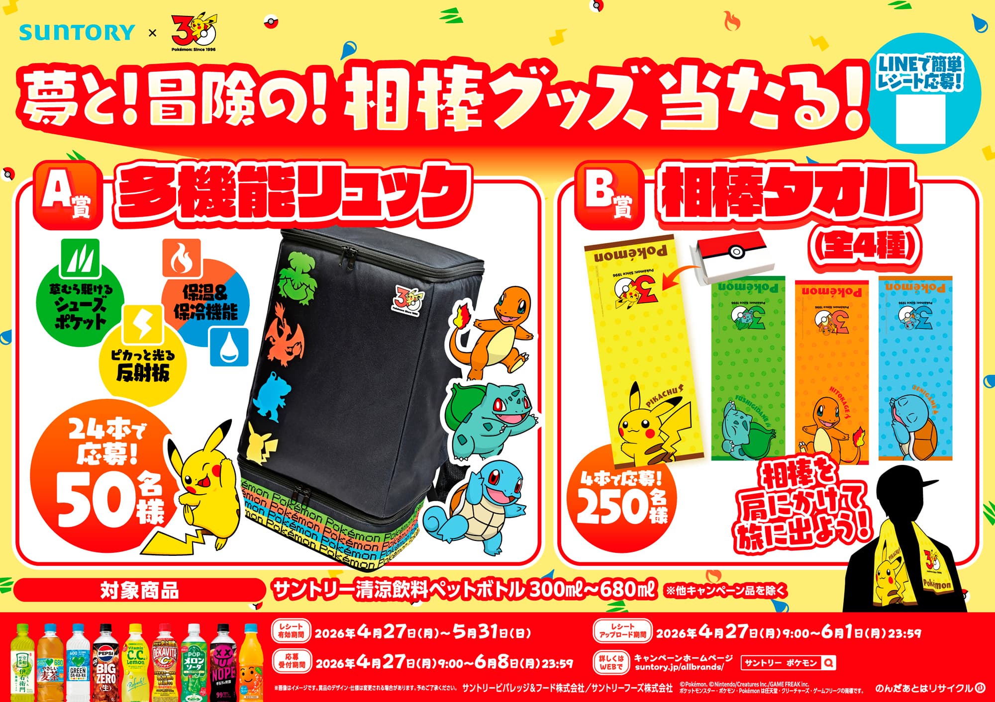 Suntory Beverage & Food has kicked off a Pokémon 30th anniversary tie-up campaign themed around "partners/companions" (相棒), beginning April 27. The campaign, titled "Dream and Adventure! Win Partner Goods! Campaign," gives consumers a chance to win original Pokémon merchandise via lottery. Alongside the campaign, Suntory also released a special "Ouchi Drink Bar Party Pack" on April 28, priced at 1,392 yen (tax excluded), which includes an original Pokémon rubber coaster.