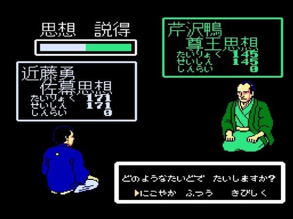 "Ishin no Arashi" was released in 1988. Its story takes place at the end of the Tokugawa Shogunate. Players become one of the 12 key figures of the time, like Ryouma Sakamoto, Kaishuu Katsu, and Takamori Saigou. They guide Japan to freedom by using persuasion and force to unify the 13 domains under one ideal, whether that is loyalty to the shogunate or the emperor, or even to the public opinion.